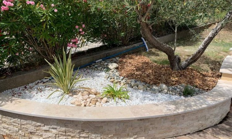 Nous proposons la plantations de végétaux mediterranéens, l'installation de décorations minérales, d'une terrasse en bois et de murets maçonnées.