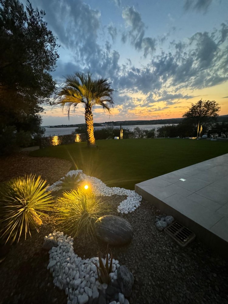 Nous proposons la plantations de palmier, l'installation de décorations minérales et du gason synthétique.